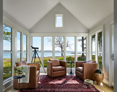 At the heart of the renovation is a dramatic vaulted “cathedral” ceiling in the main living area—an airy, light-filled space that celebrates the joy of cooking. The open kitchen anchors the room with generous work surfaces, while a bar and compact wood stove frame the dining area. A new sitting room offers expansive views of Broad Creek, bringing the outdoors in. Natural materials and a soft, light palette let the surrounding landscape take center stage.