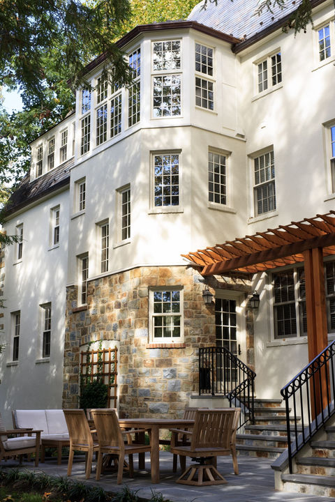 Drawing from Tudor and Norman architectural styles, a new three-story stair hall with clerestory windows was constructed to link the home vertically together and to the rear yard. In addition to the stair tower, a new three-story wing was built to accommodate all of the clients' requests. Stone, stucco, and slate helped to render this Norman project.